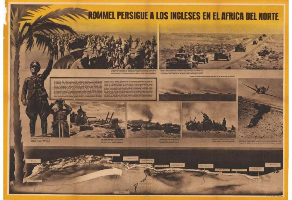 A masterpiece of persuasive art, the broadside shows a full length portrait of General Rommel, labelled, ‘El guerrero victorioso, mariscal Rommel, en su automóvil de Campania durante la batalla’ [The victorious warrior, Marshal Rommel, in his campaign vehicle during the battle’], while the silhouette of a palm tree harkens the exotic nature of the Maghreb. To the right are a series of photographs of battle scenes and captions all designed to portray Rommel as lion and his Afrikakorps as all-conquering heroes. No mention is made of the fact that the contest between Rommel and the Allies was largely a hard-fought stalemate; here one gains the impression that the Germans were effortlessly mowing down the opposition.